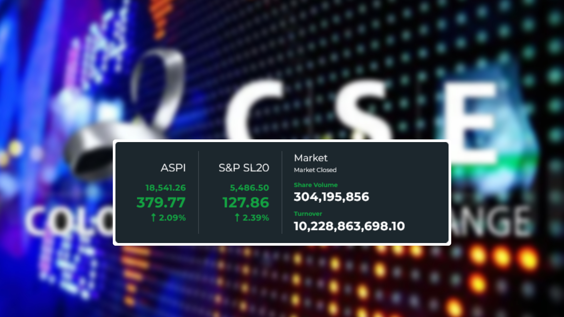 අද දිනයේ දී සියලු කොටස් මිල දර්ශකය ඒකක 379.77 ක වර්ධනයක් සනිටුහන් කරමින් දිනයේ ගනුදෙනු අවසානයේ දී ඒකක 18,541.26 ක් දක්වා ඉහළ ගියේය.