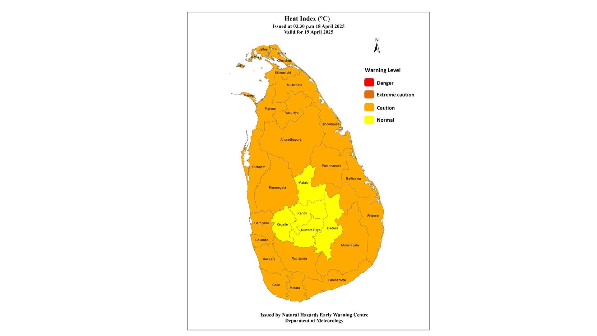 උතුර, උතුරු මැද, වයඹ, බස්නාහිර, දකුණ සහ නැගෙනහිර පළාත්වලත් රත්නපුර සහ මොනරාගල දිස්ත්රික්කවලත් ඇතැම් ප්රදේශවල උෂ්ණත්වය සෙල්සියස් අංශක 39ත් 45ත් අතර අවධානය යොමු කළ යුතු මට්ටමක පවතිනු ඇති බව එම දෙපාර්තමේන්තුව පෙන්වා දෙයි.