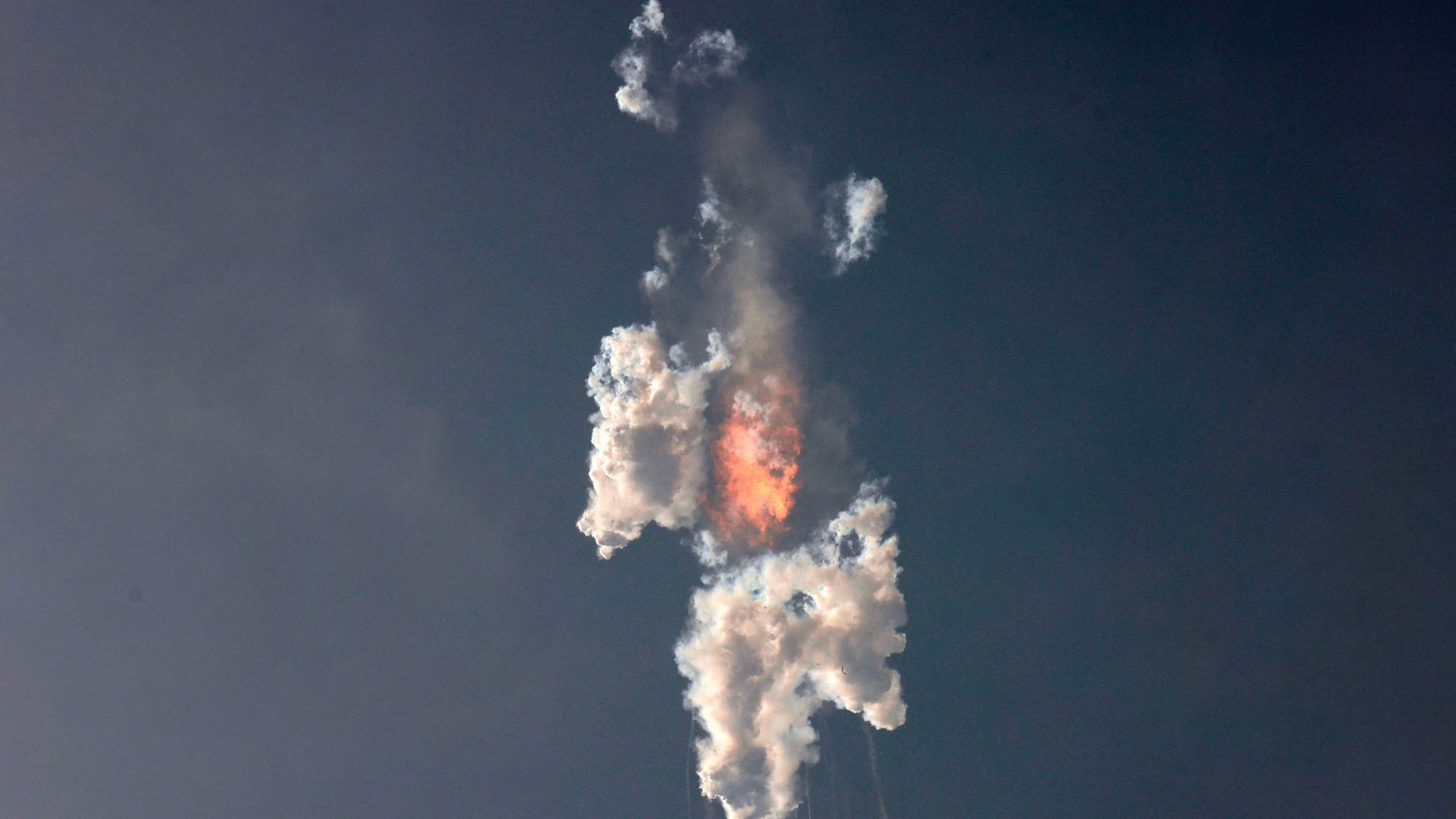 පියාසැරිය ආරම්භ වී මිනිත්තු කිහිපයකට පසු, ප්‍රතිචක්‍රීකරණය කරන ලද සුපර් හෙවි බූස්ටරය Starship ඉහළ කොටසෙන් වෙන් වී එහි එන්ජින් ක්‍රියාත්මක විය.